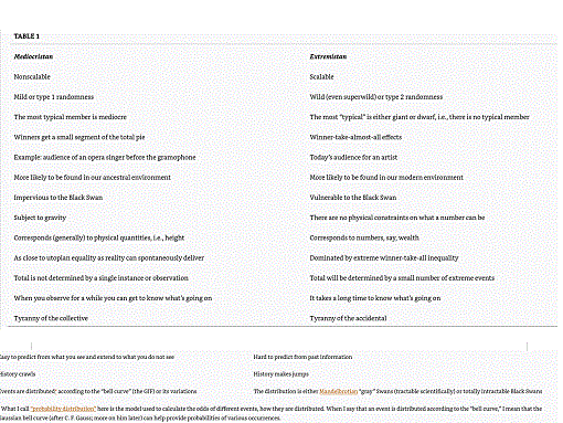 In the table given below Nassim Taleb contrasts extremistan with mediocristan.